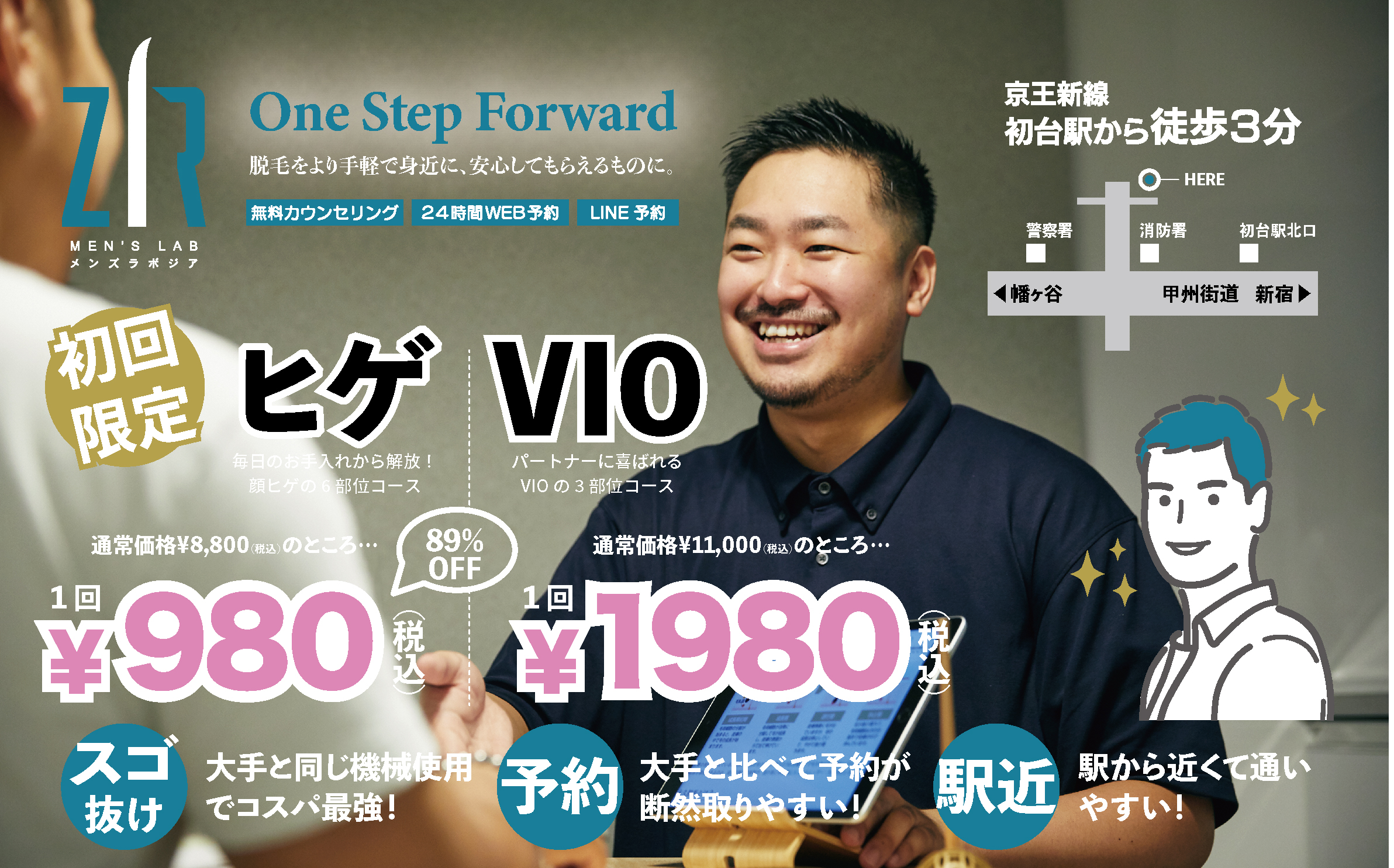 メンズラボ ジアは、大手で経験を積んだ店長が、丁寧にパフォーマンスの高い施術をご提供いたします。 ワンショットの効果が大きいIPL脱毛器を使用し、メンテナンスや産毛などの毛にも対応可能なSHR方式も選択可能となっております。また完全予約制のため、周りを気にせずリラックスして施術が受けれます。 京王新線「初台駅」から徒歩3分で好アクセス&シャワー設備も完備されているため、お仕事帰りに気軽に立ち寄ることも可能です。