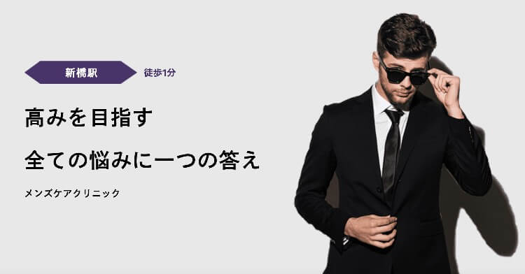 メンズケアクリニック新橋院は、AGAや脱毛、シミやそばかすなど、男性が一度は悩んだことのある悩みについて幅広く診療しています。 メンズケアクリニックは、潜在能力を最大限に引き出すメディカルスタイリストとして世の男性をエンパワーし、社会に活力をもたらすことをビジョンに掲げ男性がいつまでも若々しくいられるようサポートしてくれます。 クリニックは、新橋駅から徒歩1分という好立地で、診察も平日は22時までやっており仕事帰りでも通いやすいですね。 AGAやED治療など病院になかなか通いづらい治療は、オンライン診療もやっているので一歩踏み出すのにまだ勇気が出ない方は一度試してみてはいかがでしょうか。 >メンズケアクリニック新橋院|AGA治療についてはこちらから >メンズケアクリニック新橋院|ED治療についてはこちらから