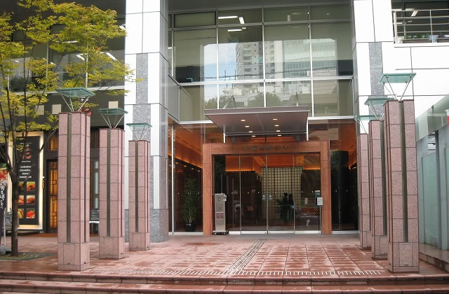ファミリーマートの向かいのガラス張りのビルがうまみ美容クリニックが入っている京阪堂島ビルです。